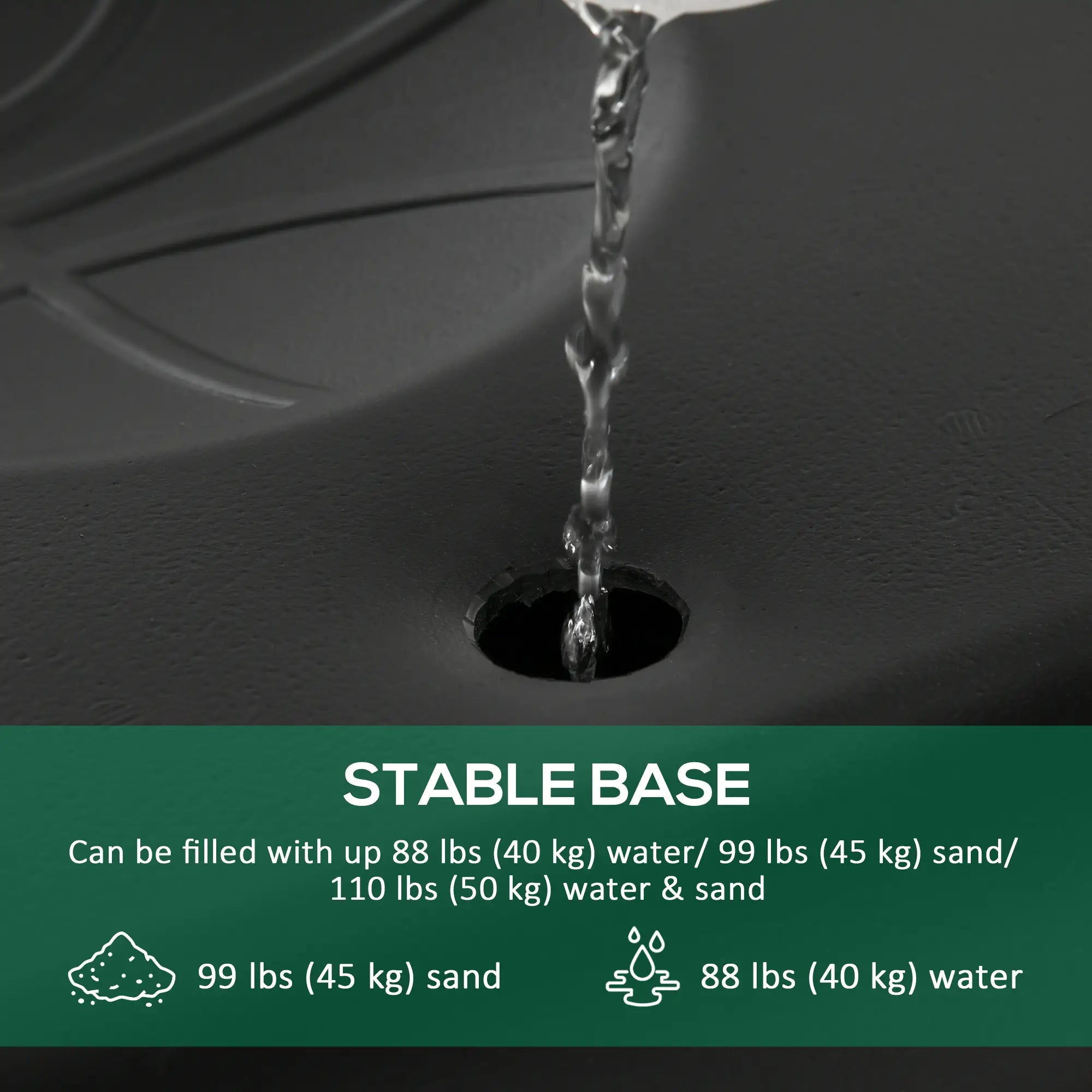 Base Capacity 88 lbs (40 kg) water, 99 lbs (45 kg) sand