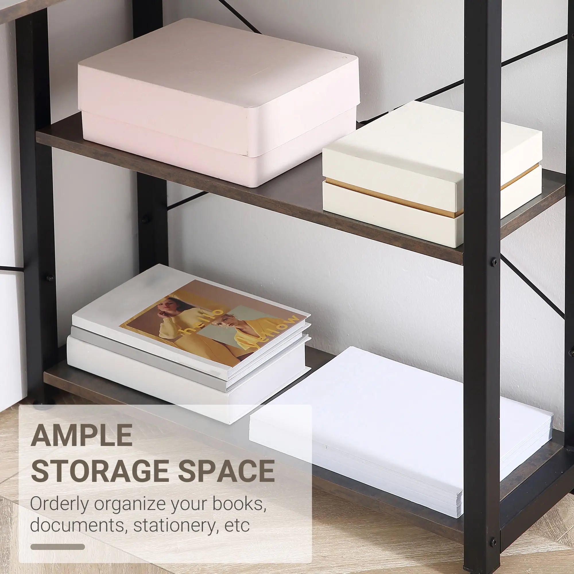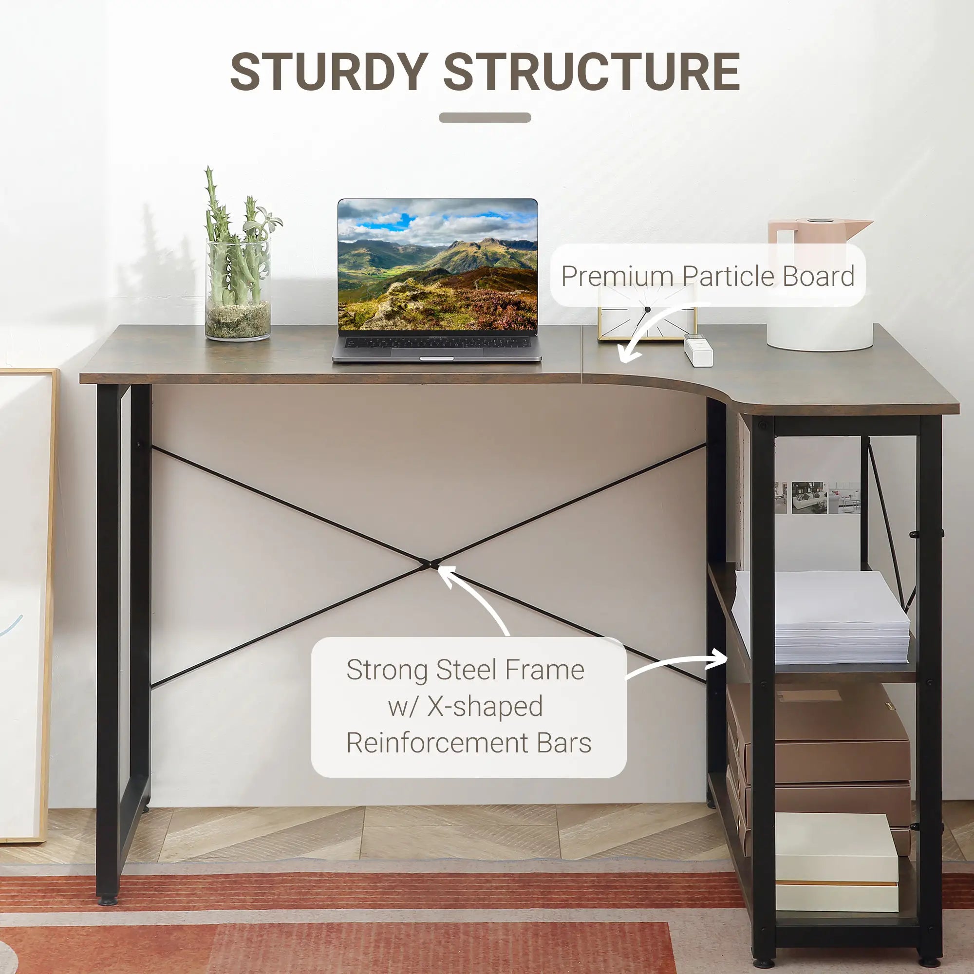 The L-Shaped Office Desk with 2 Shelves is a compact and efficient workstation designed to fit comfortably in corners, making it ideal for smaller rooms, apartments, or dorms. With a spacious desktop layout, this desk supports everything from writing and studying to multitasking with a computer setup. Built from robust particle board and supported by a steel frame with X-shaped reinforcements, it offers both durability and style. Two open side shelves provide accessible storage for books, supplies, or personal items, helping to keep your workspace tidy. A melamine-coated surface adds scratch resistance and easy cleaning, while adjustable footpads ensure level stability. Perfect for optimizing floor space, this desk delivers a strong blend of functionality and modern simplicity.