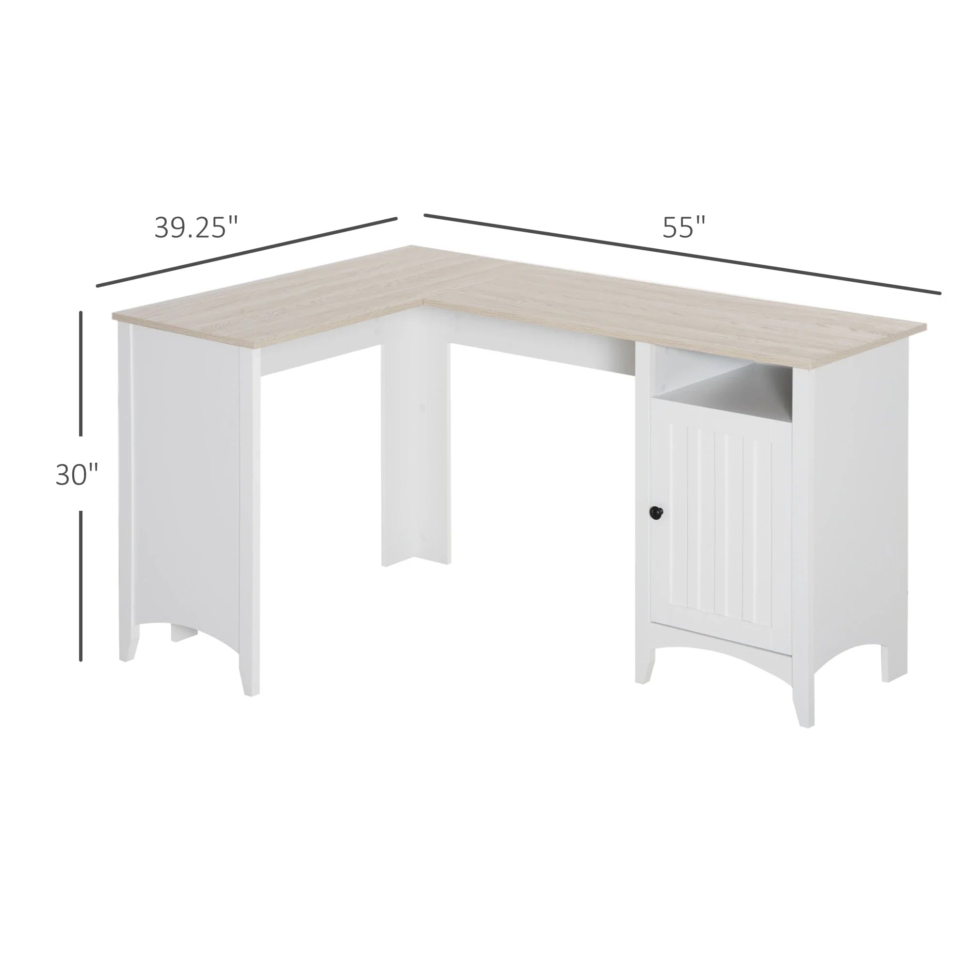 The L-Shaped Office Desk with Cabinet and Shelf offers a space-saving layout and modern functionality, ideal for corner placement in home offices or study areas. With a generous two-part tabletop, this desk provides ample room for computer work, writing, or multitasking. A two-tier storage cabinet with doors and an open shelf keeps essentials neatly organized and within easy reach. The adjustable shelf inside the cabinet lets you customize your storage layout, while the durable particle board surface features a protective paint coating for water resistance and easy cleaning. Finished in a natural wood and white colour scheme, this desk adds a clean and functional touch to any workspace.